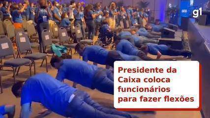 Presidente da Caixa coloca funcionários para fazer flexões em evento em Atibaia — Foto: Reprodução/Sindicato dos Bancários do ABC