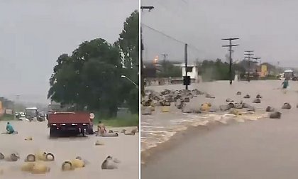 Rio sobe, alaga ruas e provoca enxurrada de botijões de gás em Itabuna-BA