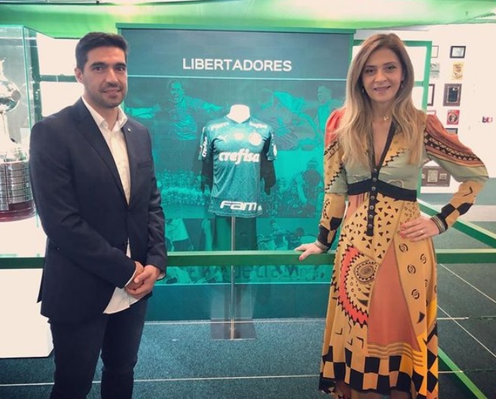 Abel Ferreira, técnico do Palmeiras, e Leila Pereira, na sala de troféus do clube — Foto: Reprodução