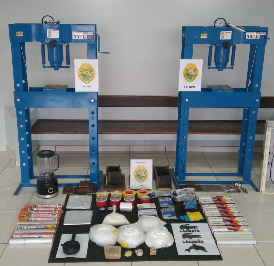 A equipe conseguiu visualizar pela fresta da porta uma balança de precisão e algumas embalagens que costumam ser utilizadas para embalar entorpecentes. Em buscas no local foram localizadas duas prensas industriais, e várias peças de ferro ou metal utilizados nas prensas, 04 logotipos utilizados comumente para marcar tabletes de cocaína, em cima de uma mesa foram localizados 03 pacotes plásticos contendo em seu interior substancia análoga a cocaína pesando 2.055 kg, 01 pacote plástico contendo em seu interior droga do tipo “md” ou “cristal” pesando 600 gramas, 03 porções de substância análoga a crack embaladas em plástico filme e metade de um tablete da mesma substância que posteriormente pesados totalizaram 628, vários rolos de plástico filme, pacotes de embalagens para acondicionar as drogas, alguns rolos de fita adesiva nas cores amarela e vermelha, um liquidificador que era utilizado para misturar e produzir os entorpecentes e ainda uma espécie de estufa que estava sendo utilizada para secagem de uma porção não embalada da droga conforme foto em anexo, que pesada totalizou 897 gramas e ainda um carregador de pistola 9mm com capacidade para 50 munições.
