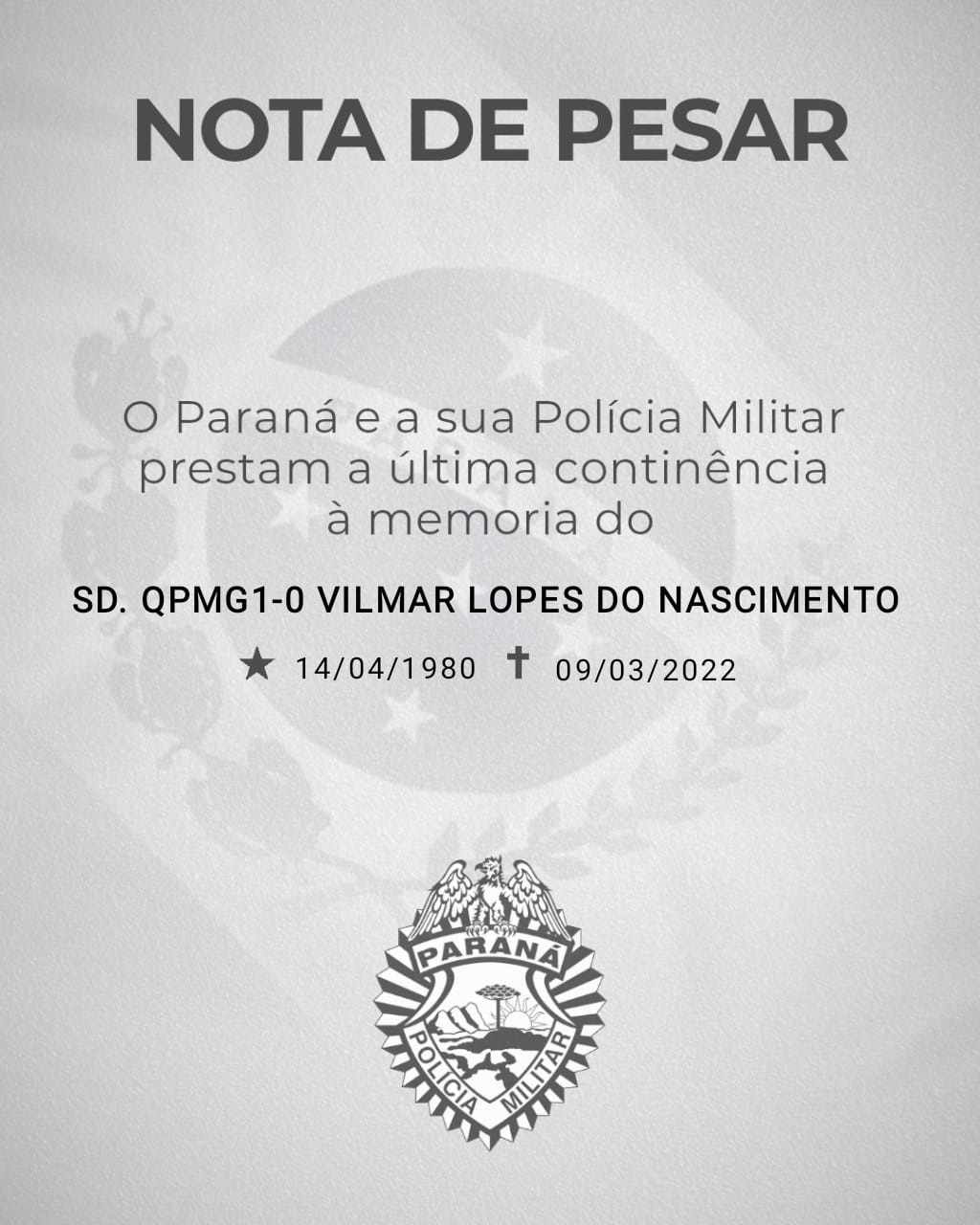 É com pesar, que o 16º Batalhão de Polícia Militar, comunica o falecimento do Sd. QPMG1-0 Vilmar Lopes do Nascimento, nesta Quarta-feira, 09/03/2022.