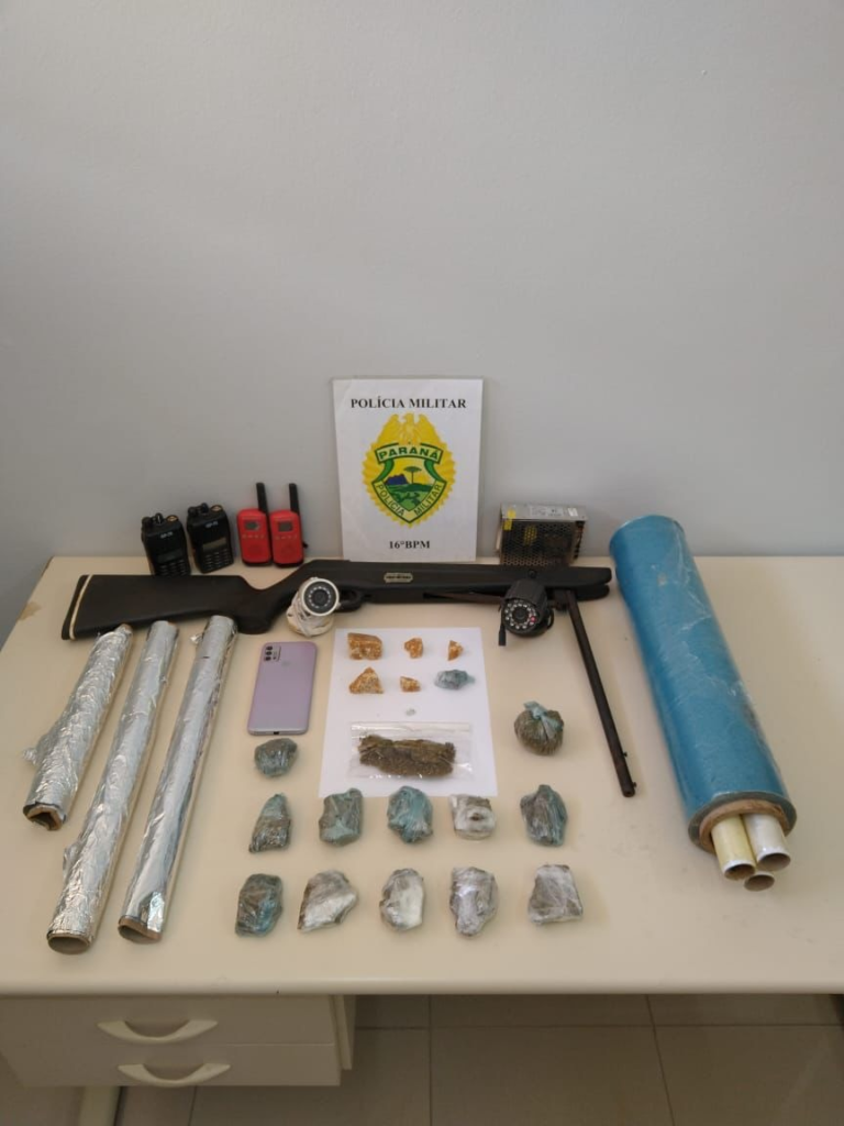 Foi Localizada também uma carabina de pressão sem marca aparente. Diante dos fatos, foi dado voz de prisão e encaminhado juntamente com os objetos apreendidos até a Delegacia de Polícia.