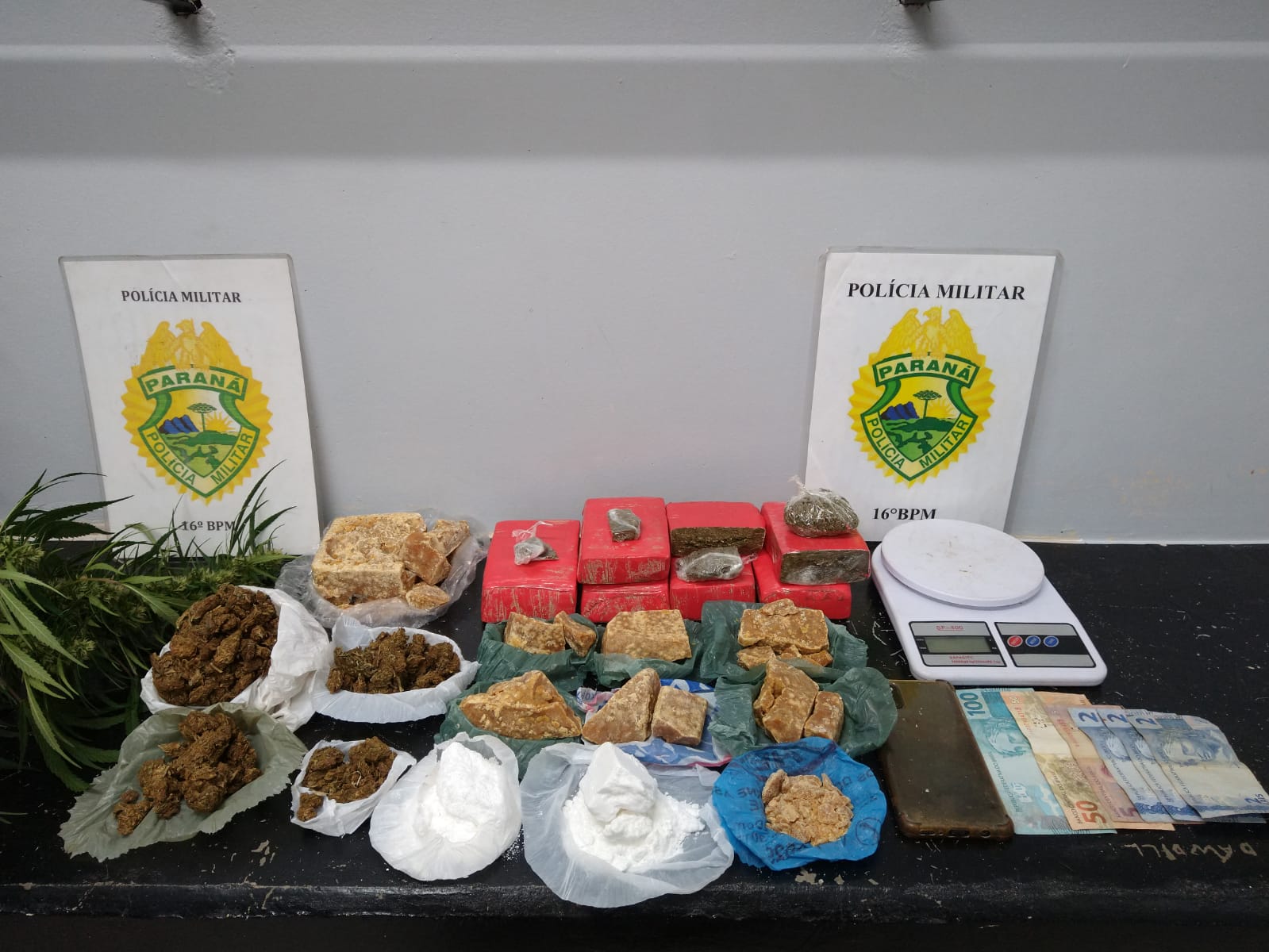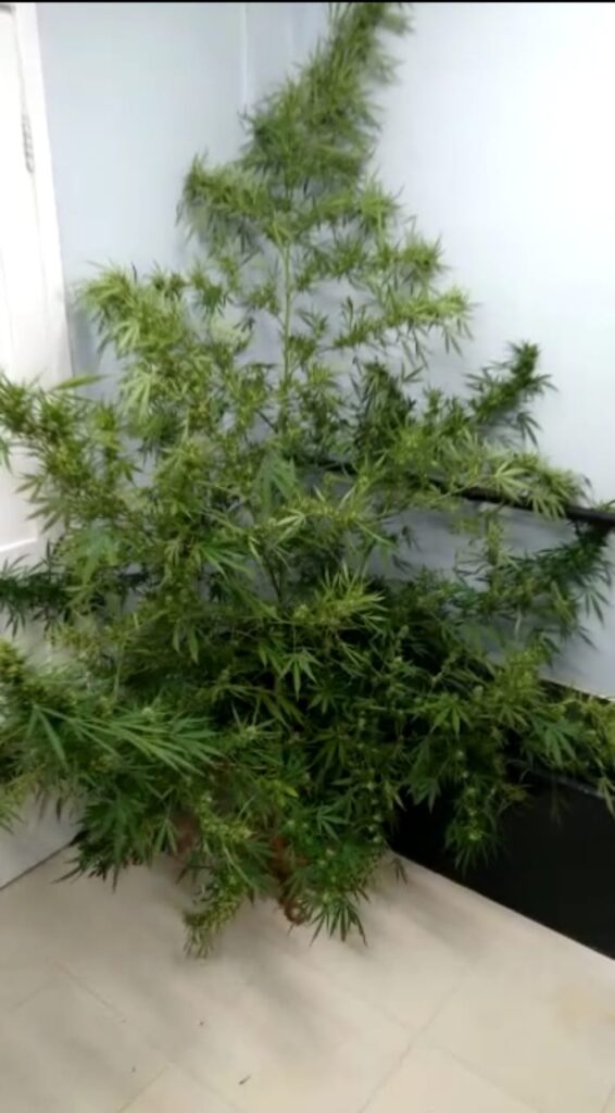 Foi efetuado adentramento tático no local e localizado ao lado da residência uma planta de Canabis de aproximadamente dois metros e meio (2,5 m) de altura, feita a abordagem na residência de fundos, sendo localizado um masculino, o qual estava com as vestes acima citadas, em busca pessoal nada de ilícito foi localizado com o mesmo, somente a quantia de R$ 161,00 (cento e sessenta e um reais) em notas de dinheiro trocadas, característico da venda de entorpecentes, em cima da mesa da cozinha foi localizado uma bucha de substância vulgarmente conhecida como maconha.