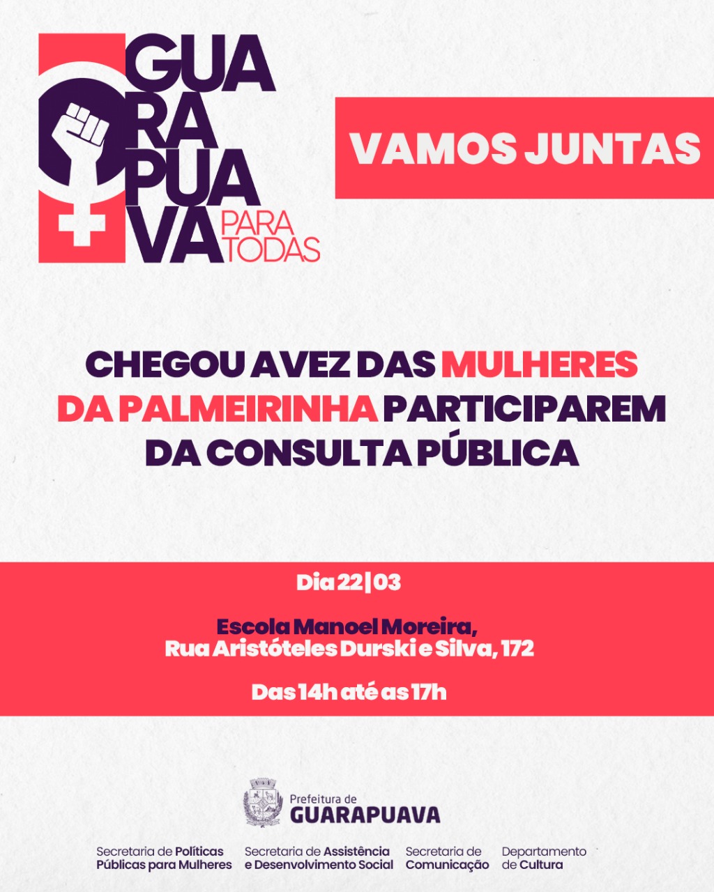 No dia 22 de março, a Secretaria de Políticas Públicas Para as Mulheres irá ao distrito da Palmeirinha para que as moradoras respondam a Consulta Pública ‘Guarapuava Para Todas’. O evento será na Escola Municipal Manoel Moreira, das 14h às 17h.