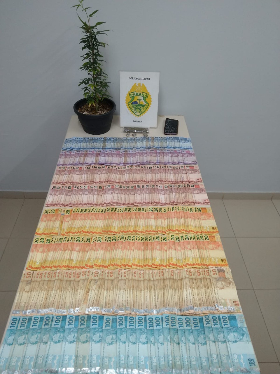 Em busca pessoal no indivíduo posteriormente identificada como um homem, de 22 anos, nada de ilícito foi localizado, porém em buscas veicular foi constatado que o abordado quebrou seu aparelho celular sendo um Xiaomi Redmi na cor Azul, e em cima do banco do passageiro foi localizada uma sacola plástica contendo grande quantidade de dinheiro trocado, posteriormente contado totalizando R$ 3.039,00 (três mil e trinta e nove reais) característico da venda de entorpecentes.