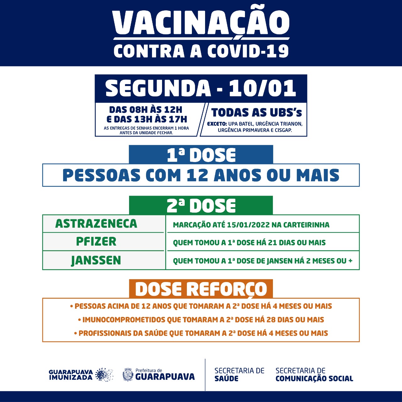 As vacinas disponíveis continuam sendo divulgadas por meio do boletim da Campanha. Nesta segunda-feira, serão aplicadas primeiras doses para quem tem 12 anos ou mais e segundas doses da Pfizer (21 dias depois da primeira aplicação), segundas doses da AstraZeneca, data na carteirinha até 15 de janeiro, e dose de reforço para quem tomou a Janssen há mais de 2 meses.