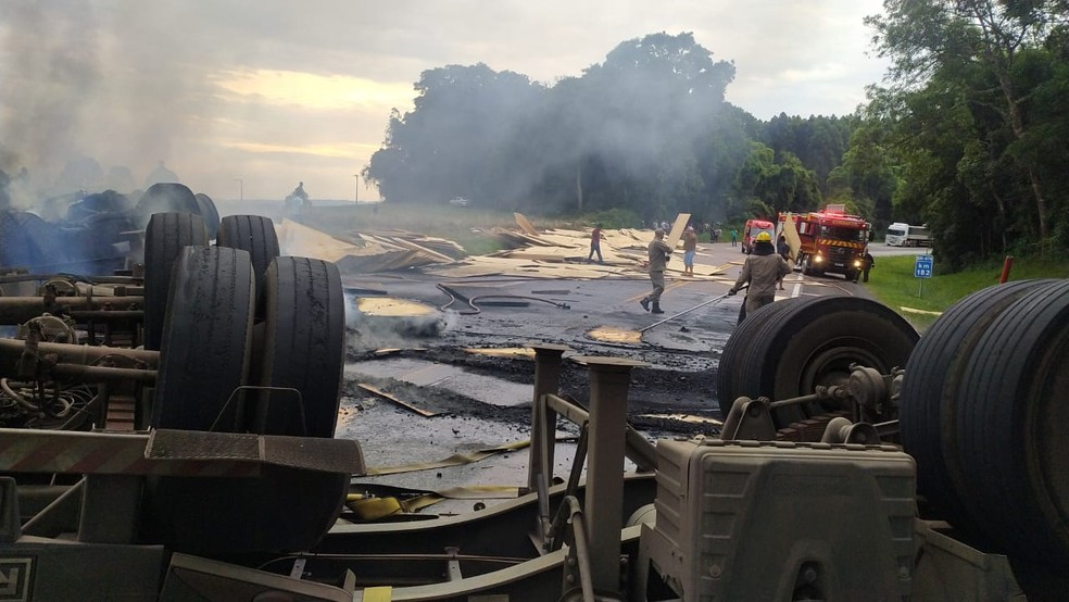 Um caminhão carregado com madeira tombou e pegou fogo na BR-476, na Lapa, cidade da Região Metropolitana de Curitiba. Segundo a Polícia Rodoviária Federal (PRF), o acidente aconteceu no fim da tarde de segunda-feira (13).