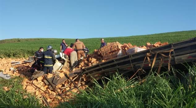 Caminhão carregado com tijolos se envolve em grave acidente na PR-090