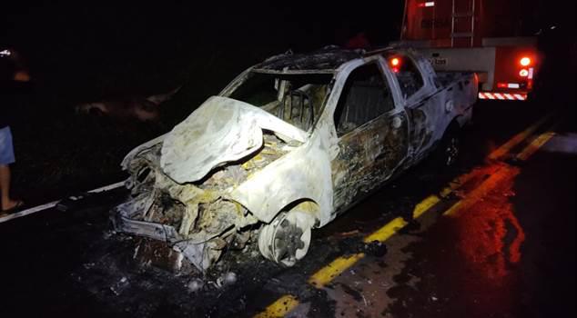 Carro pega fogo após atropelar vaca na PR-573, em Corbélia
