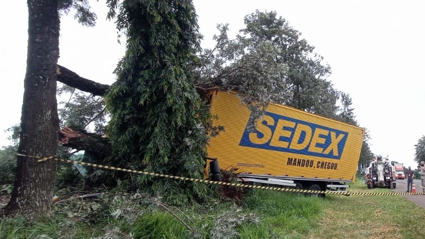 Um caminhão da Empresa Brasileira de Correios e Telégrafos bateu contra uma das árvores da margem da rodovia PR-323, nesta manhã de quinta (13). O acidente aconteceu entre Sertanópolis e Sertaneja, no Norte do Paraná.