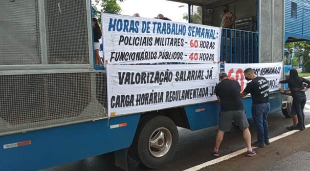 PMs (Policiais Militares) de Londrina se reuniram neste sábado (29) em frente ao Estádio do Café para um protesto que pede ao governo do Paraná a regulamentação da jornada e reajuste salarial da categoria.