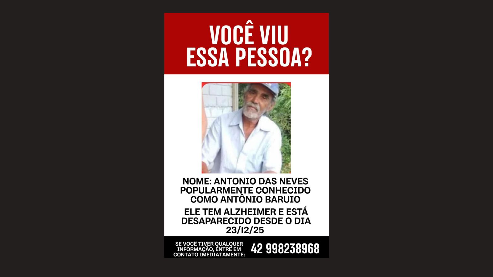 O senhor Antônio das Neves, conhecido como “Baruio”, está desaparecido desde 23 de dezembro de 2025. Ele foi visto pela última vez nas proximidades da comunidade Bandeira, em Campina do Simão, na região Centro-Sul do Paraná. Desde então, familiares aguardam informações que possam indicar seu paradeiro e reforçam o apelo para que a população ajude com qualquer detalhe que possa contribuir para encontrá-lo com segurança.