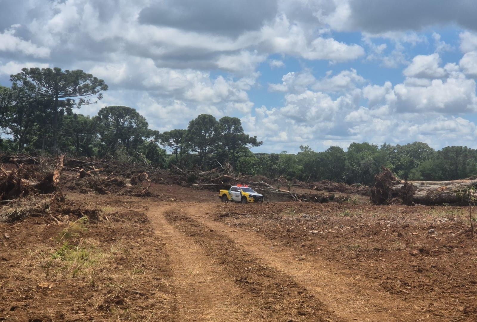 Na segunda propriedade fiscalizada, a equipe registrou a supressão de 215 árvores de Pinheiro-do-Paraná (Araucaria angustifolia). Em desfavor do proprietário, foi emitido auto de infração ambiental no valor de R$ 107.500,00. A tipologia da intervenção foi descrita como corte de espécie ameaçada, o que, além de impacto ecológico direto, eleva o grau de rigor regulatório aplicado ao caso. Os procedimentos incluem registro do material, localização e identificação do responsável.