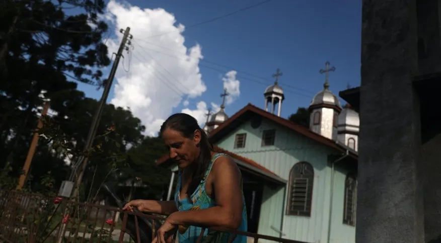 Mulher caminha em frente a uma igreja em Prudentópolis/ Pilar Olivares/Reuters